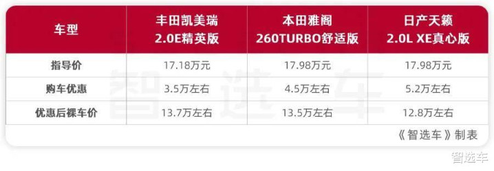 时间回到几年前,13万左右的预算只能买到一款合资A级车,但如今已经可以拿下曾经高高在上的“日系三剑客”——丰田凯美瑞、本田雅阁、日产天籁。