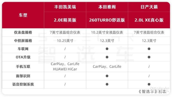 凯美瑞就显得有些小气了,精英版配备7英寸液晶组合仪表,中控屏尺寸也只有10.25英寸,科技感差了点,车机系统功能不算丰富,好在支持CarPlay、CarLife和HUAWEI HiCar,更多是依靠手机互联来实现导航、娱乐等功能。