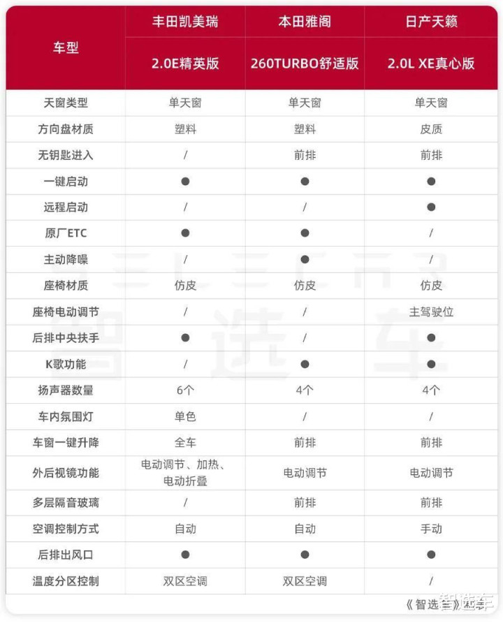 所以还是那个老生常谈的话题,如果想买台合资B级车,“日系三剑客”应该怎么选?今天我们就拿凯美瑞2.0E精英版、雅阁260TURBO舒适版、天籁2.0L XE真心版,这三款车的入门版本,看看作为家用车的话,到底谁更贴合需求?